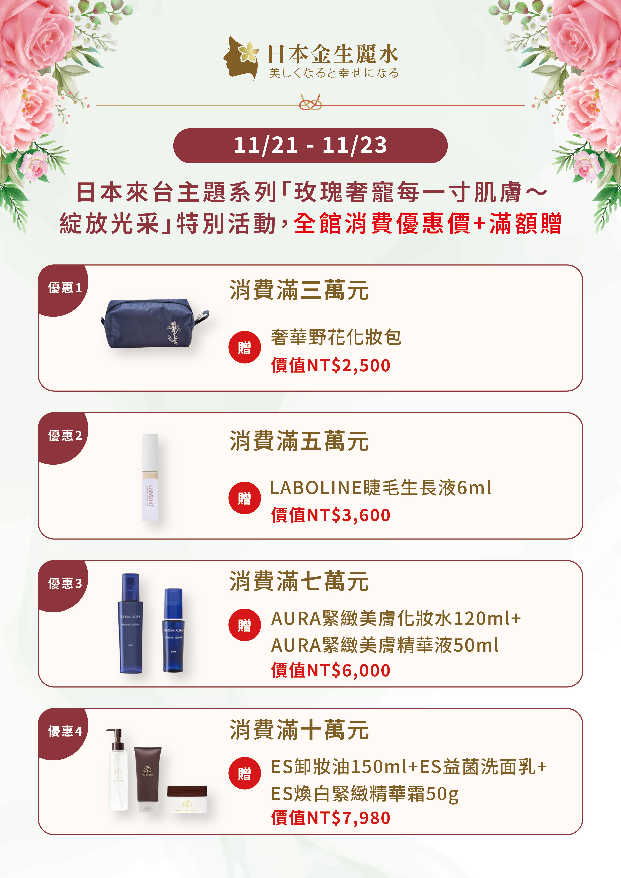 金生麗水34週年日本來台11/21~11/23玫瑰系列寵愛自己活動加碼送❤️